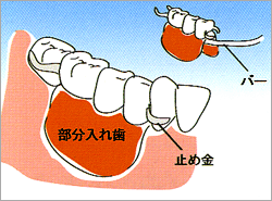 取り外し式の入れ歯では、左右の歯をつなぐバーを渡し、さらに止め金(クラスプ)を使って固定します。