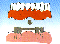 数本のインプラントを埋め込み、連結した維持装置に入れ歯をしっかりと固定します。