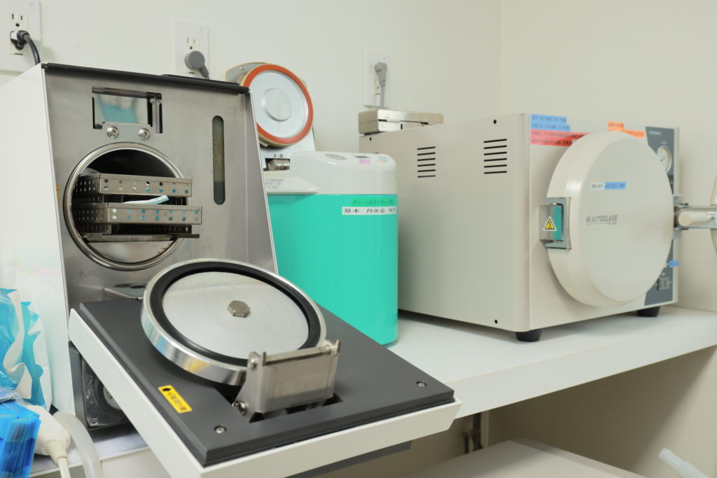 診療に繰り返し使用する器具は121度の高圧蒸気で20分間にわたり高温と圧力で滅菌を行う機械(オートクレーブ)で滅菌を行います。
