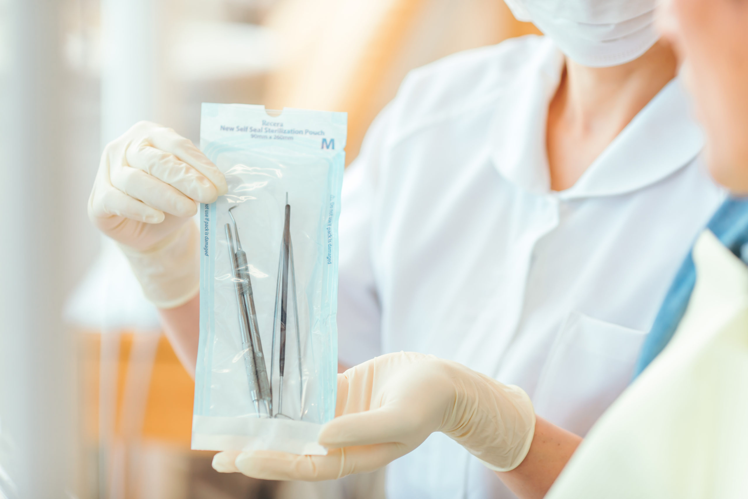 治療に使用する機材を滅菌パックにいれて滅菌処理後保存し、使用直前に開封することで院内感染に配慮しています。